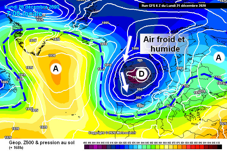 Schéma de la situation atmosphérique pour le lundi 28 décembre 2020 – Modèle GFS via météociel .fr