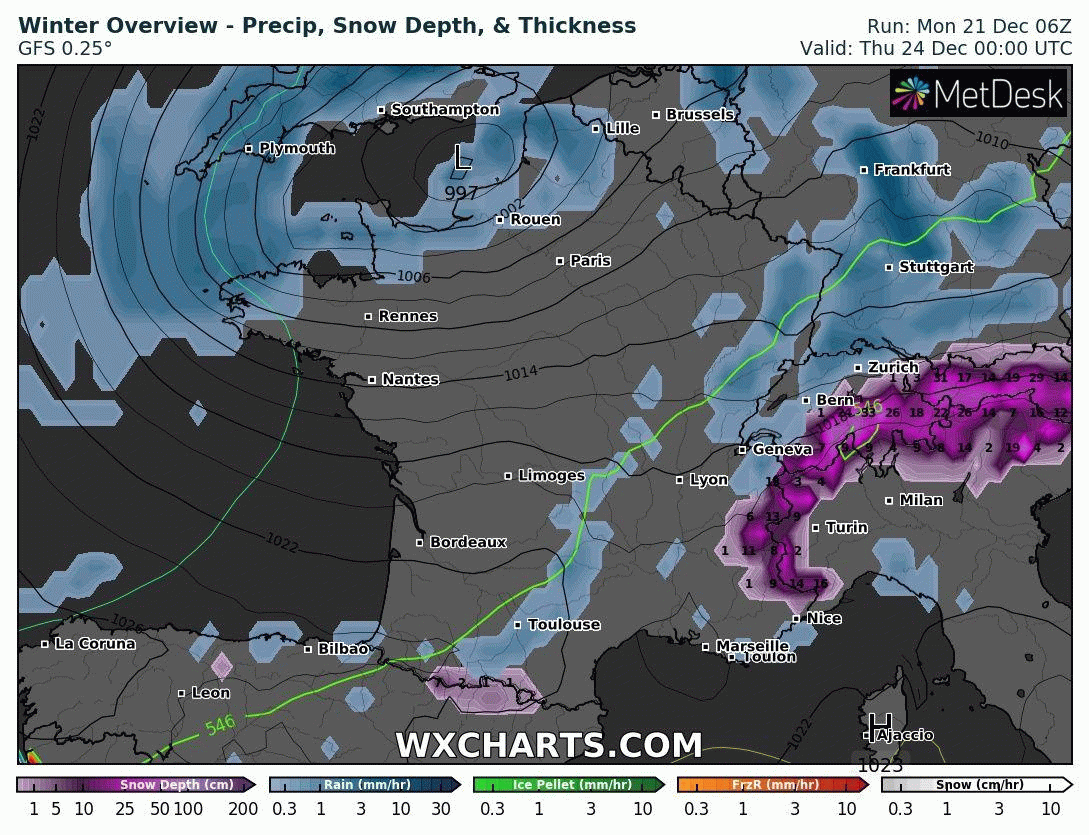 Dans ce flux, les précipitations devraient se bloquer contre les reliefs du Nord du Massif-Central, du Nord des Alpes et entre les Vosges et le Jura alors que l’air froid s’infiltrera franchement sur ces régions. Ainsi, si les première précipitations neigeuses devraient se produire à partir de 900/1000m en journée de Jeudi sur les reliefs cités précédemment, cette limite pluie-neige devrait peu à peu s’abaisser entre le réveillon et vendredi 25 décembre.