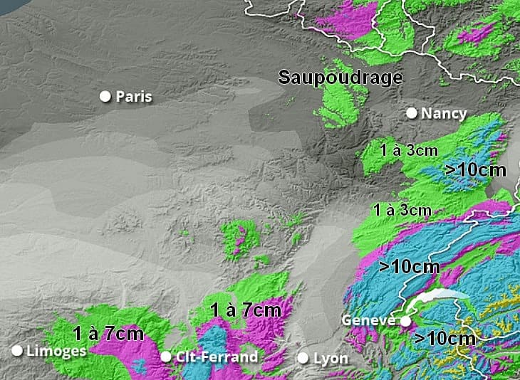 Cette limite pluie-neige devrait se montrer encore plus basse entre les Vosges, le Jura et le Nord-Est du pays avec des flocons tombant dès 100/200m d’altitude et une couche neigeuse possible dès 200/300m. La couche pourrait d’ailleurs dépasser 10/15cm dès 500m d’altitude entre les Vosges et le Jura d’ici la fin du week-end, plutôt 500/600m sur le Nord du Massif-Central. Un saupoudrage pourra également être observé sur les plateaux du Nord-Est du pays.