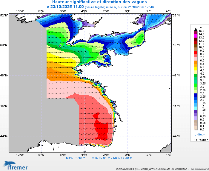 Hauteur de la houle sur l'Atlantique ce jeudi 23 octobre 2025 - Ifremer