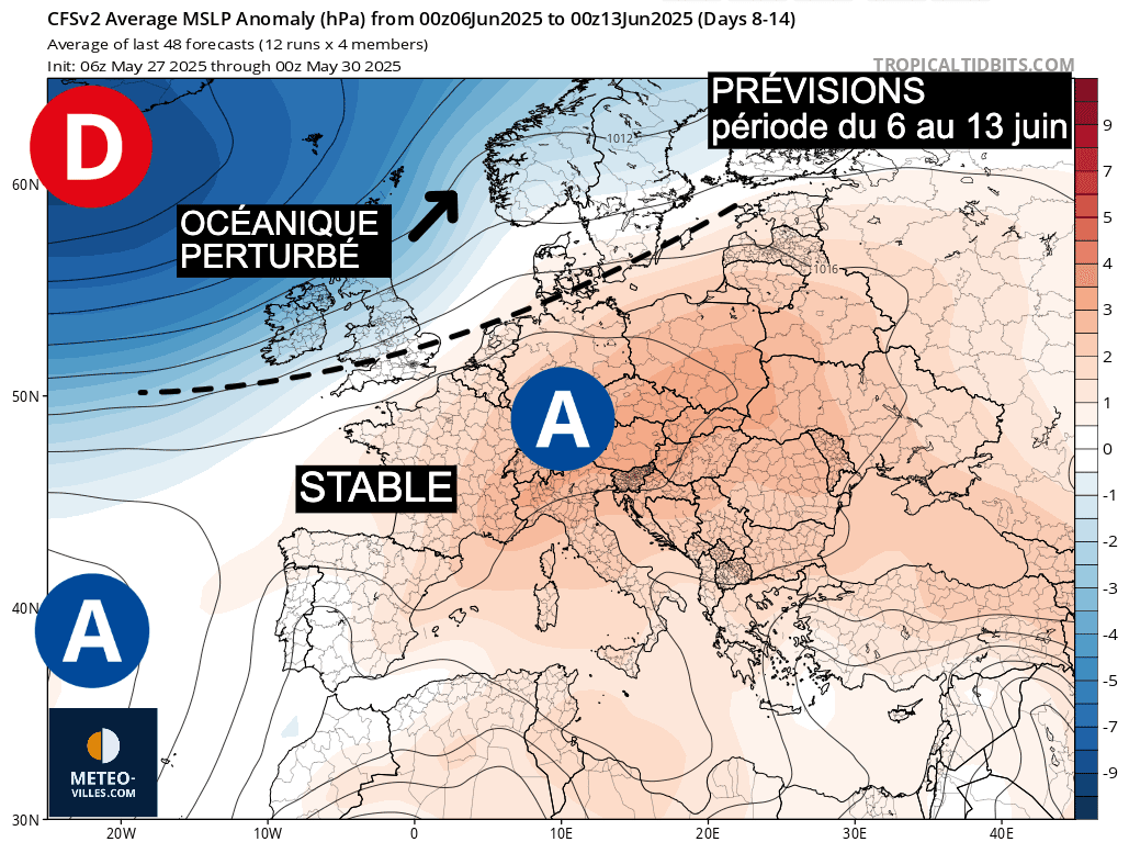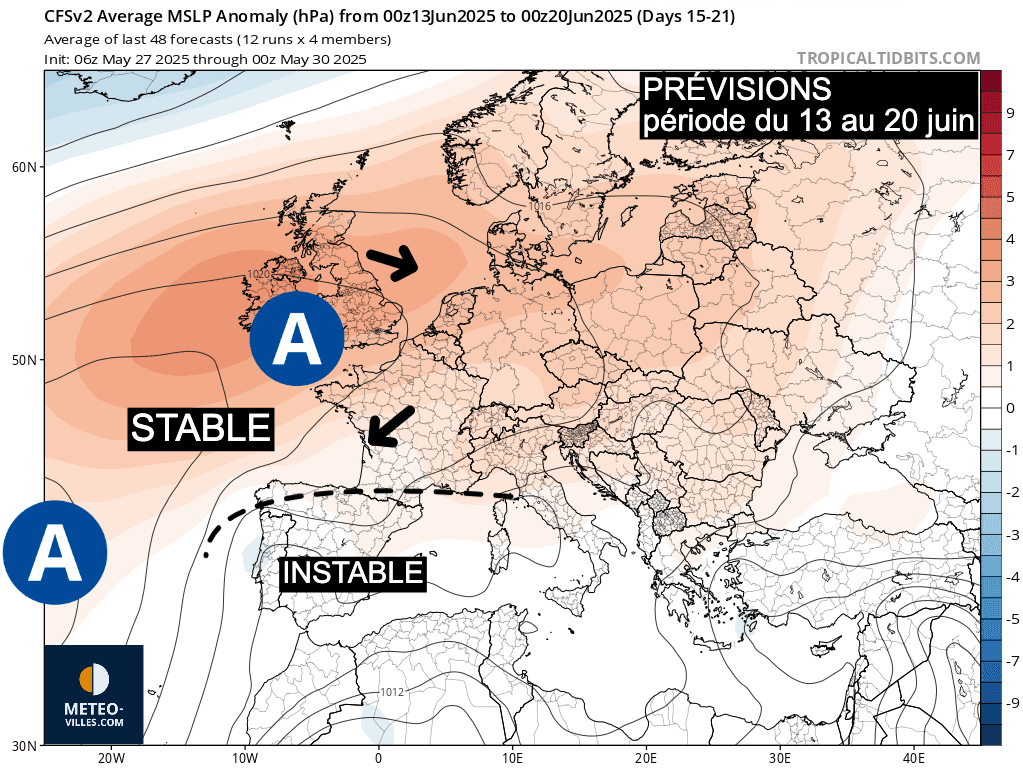 L’anticyclone se rétablit progressivement et le temps redevient stable sur une bonne partie de la France avec des températures plus estivales (et même temporairement très élevées sur la moitié Sud). Une tendance orageuse finit par se dessiner à partir du 12 juin.