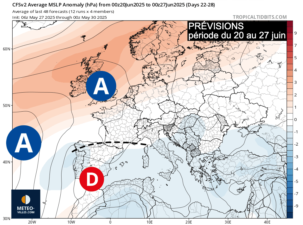 Si l'on en croit la simulation générale à l'échelle de l'Europe, en cette fin juin, l’anticyclone pourrait se rétracter sur les îles britanniques, véhiculant de l’air un peu plus humide et un peu plus frais sur la moitié Nord avec des nuages plus nombreux. Les régions du Sud continueraient à connaître une situation plus estivale.