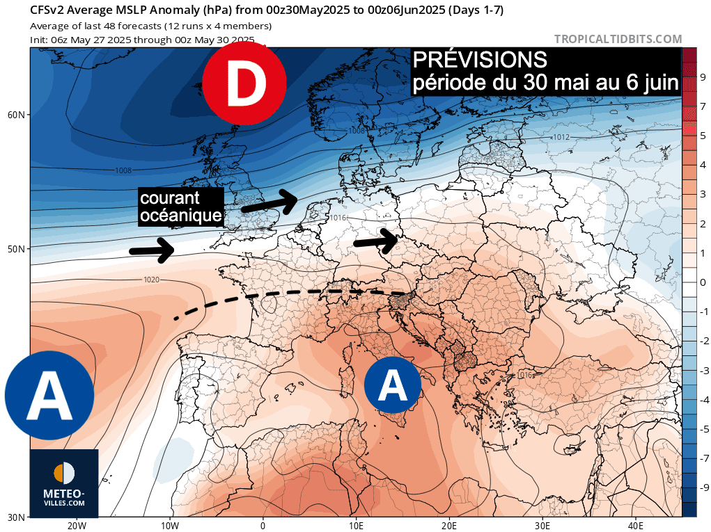 Après la chaleur exceptionnelle de la fin du mois de mai, le courant océanique perturbé se rétablit progressivement par la moitié Nord et finit par gagner très temporairement la moitié Sud (hormis les régions méditerranéennes).