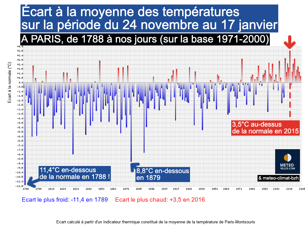 En considérant la période la plus froide, s’étendant du 24 novembre au 17 janvier, celle-ci est de loin la plus froide jusqu'à nos jours.  Durant cette période du 24 novembre 1788 au 17 janvier 1789 (1 mois et trois semaines), la température aurait été de 11,4°C en-dessous de la moyenne 1971-2000 !!! Inimaginable de nos jours !