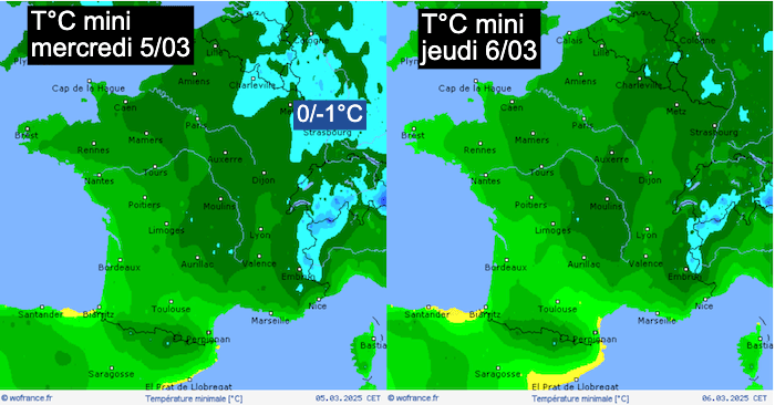 Températures minimales prévues le 5 et le 6 mars 2025, le gel apparaît en bleu - WeatherOnline