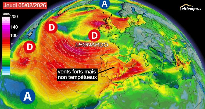 Une dépression située sur l'Atlantique - au large de la France - génère actuellement du mauvais temps sur l'ouest de l'Europe et particulièrement sur l'Espagne et le Portugal. Ainsi, les services météo espagnols ont décidé d'attribuer un nom à celle-ci. Après Kristin, c'est donc Leonardo qui était le prochain nom sur la liste et qui a été attribué. Ainsi, on peut entendre que la "tempête Leonardo" frappe la péninsule ibérique. Problème : les vents sont forts mais pas vraiment tempétueux. Ils seront souvent compris entre 80 et 100 km/h sur l'Espagne ce jeudi 5 février 2026. Pourquoi donc avoir nommé cette "tempête" ?