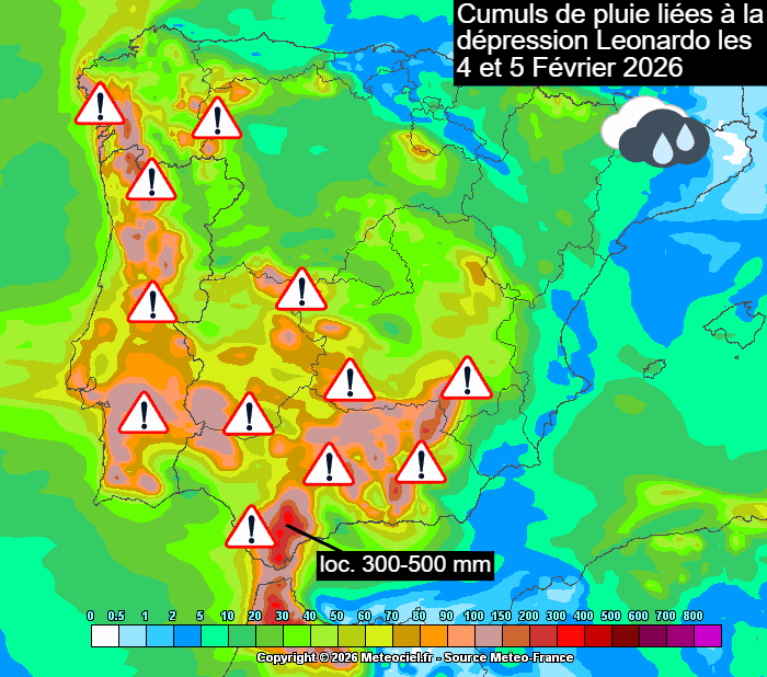 Cumuls de pluie liés à la dépression Leonardo sur Espagne & Portugal les mercredi 4 et jeudi 5 février 2026 - meteociel.fr