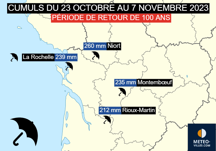 Si la pluviométrie est déjà exceptionnelle à échelle nationale, certaines régions de France se distinguent par des cumuls de pluie tout bonnement remarquables. C'est notamment le cas dans le centre-ouest de l'hexagone. Sur la période de deux semaines s'étirant entre le 23 novembre et le 7 octobre 2023, certaines stations affichent des cumuls de pluie d'une durée de retour de 100 ans ! C'est le cas de La Rochelle en Charente-Maritime avec 239 mm de pluie en 15 jours mais également de Niort dans les Deux-Sèvres où il est tombé 260 mm de précipitations en seulement deux semaines ! De telles quantités, même en automne, sont tout bonnement remarquables et ont conduit à des crues.