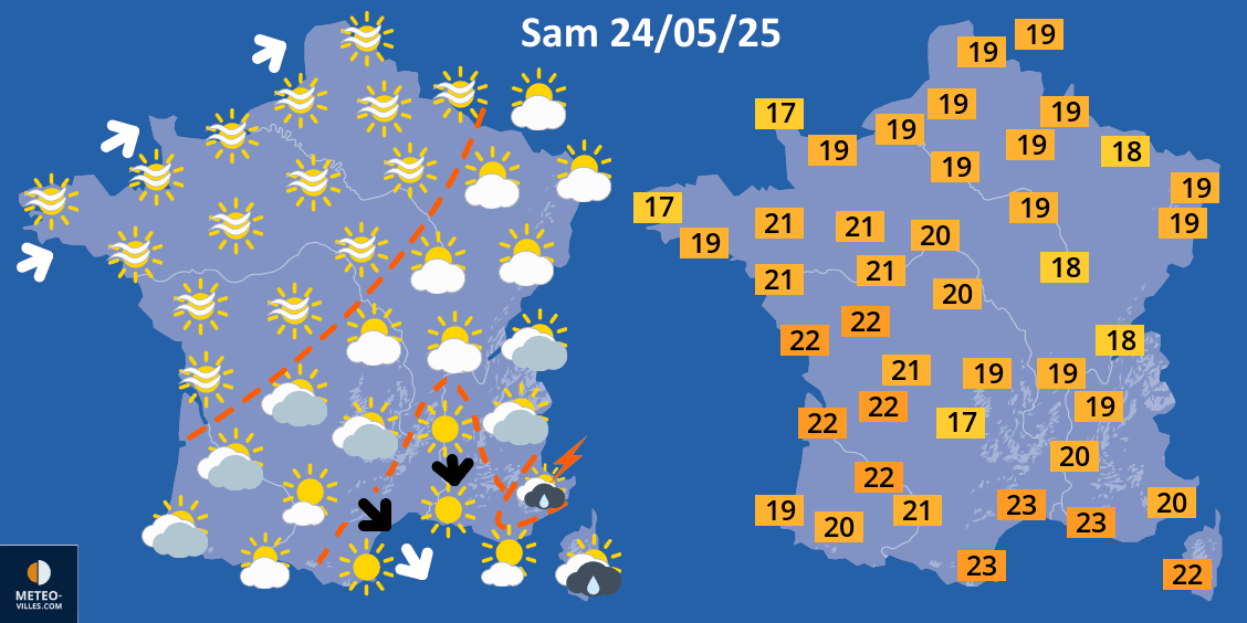 La journée du samedi 24 mai 2025 s'annonce calme, en dehors de quelques averses orageuses l'après-midi vers le sud des Alpes et la Corse. Le ciel alternera entre passages nuageux et éclaircies sur une grande partie du territoire. Au nord-ouest, on prévoit un voile d'altitude de plus en plus épais au fil des heures. Les températures maximales peineront à atteindre les normales, évoluant souvent entre 17 et 19°C dans le nord et l'est, plutôt 20 à 22°C au sud et à l'ouest et jusqu'à 23°C aux abords du golfe du Lion.