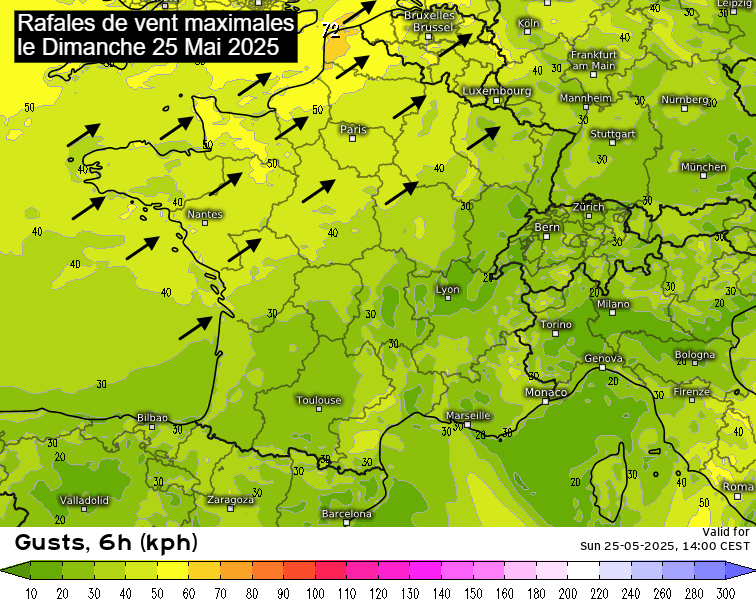 Au nord-ouest, le ressenti de ce dimanche 25 mai 2025 promet d'être automnal. Outre le front pluvieux, un vent de sud-ouest assez sensible soufflera sur le quart nord-ouest de la France et la Belgique avec des rafales proches de 50 km/h. Elles atteindront même les 70 km/h sur la côte d'Opale, amenant un ressenti bien frais.