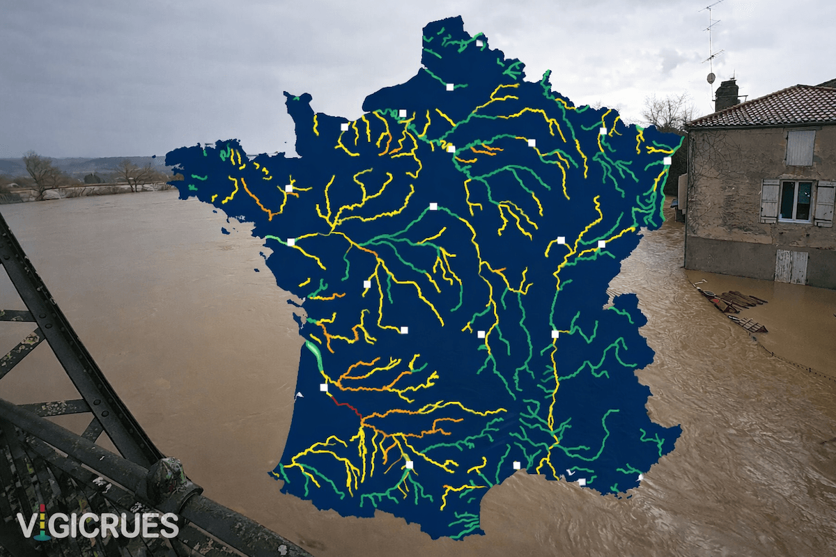 Crue majeure de la Garonne à Saint-Léger (47) le jeudi 12 février 2026 - photo Geoffrey Bigey & carte de vigilance des cours d'eau en France au vendredi 13 février 2026 au soir