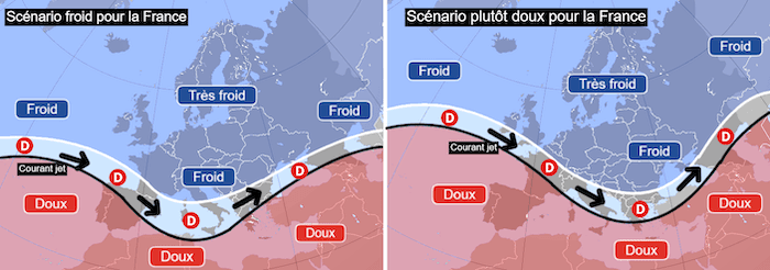 Or, le courant jet marque en général la délimitation entre les masses d'air doux/chaud subtropicales qui se situent au sud de celui-ci et les masses d'air froid polaires qui se trouvent au nord de celui-ci. De ce fait, si celui-ci s'oriente vers la Méditerranée, la France se situera donc au nord de ce fort vent d'altitude, ce qui devrait donc permettre à de l'air plus froid venu du nord du continent de s'écouler vers notre pays.
