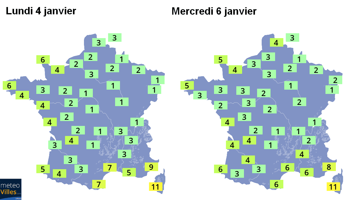 Températures maximales envisagées pour le lundi 4 et le mercredi 6 janvier – Météo-Villes