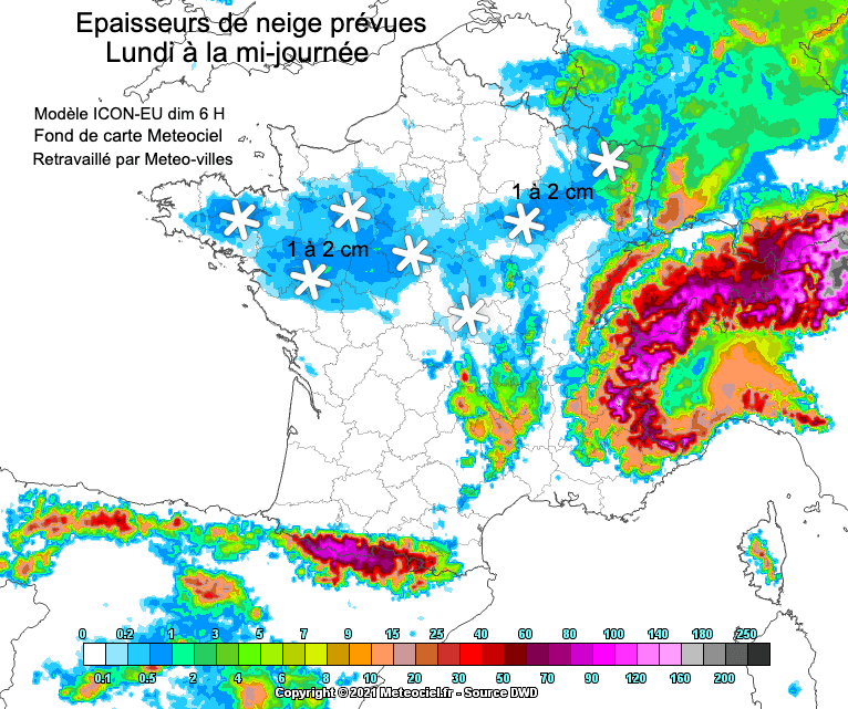 Dans le même temps une masse d’air plus humide devrait déborder de mer du Nord, provoquant la formation de giboulées neigeuses plus au moins étendues des côtes de la Manche aux frontières du Nord-Est, en passant par le Nord de la Seine.