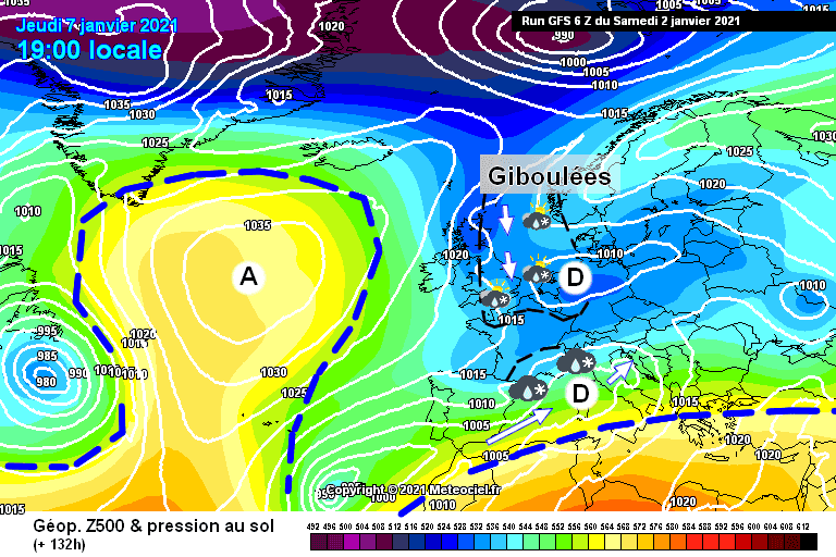 Schéma de la situation atmosphérique envisagée sur l’Ouest de l’Europe le jeudi 7 janvier – Modèle GFS via météociel.fr