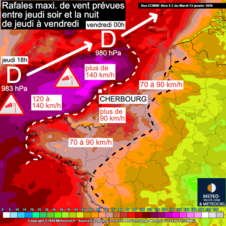 Jeudi soir, une dépression va rapidement se former au large de la Cornouailles, atteignant 983 hPa à 18h sur la pointe sud-ouest de l’Angleterre.  Un gradient de pression particulièrement resserré se formera juste à l’arrière de la dépression, générant des vents très forts.  Ces vents pourraient largement dépasser les 100 km/h sur une grande partie de la Manche. À minuit, la dépression se sera encore un peu creusée et se situera sur le sud de l’Angleterre, à la hauteur du Cotentin. Les rafales les plus fortes se produiront au sud de la dépression, avec des valeurs pouvant dépasser 150 km/h entre les îles Anglo-Normandes et l’extrême nord du Cotentin. Le cap à la Hague semble particulièrement exposé vers minuit.