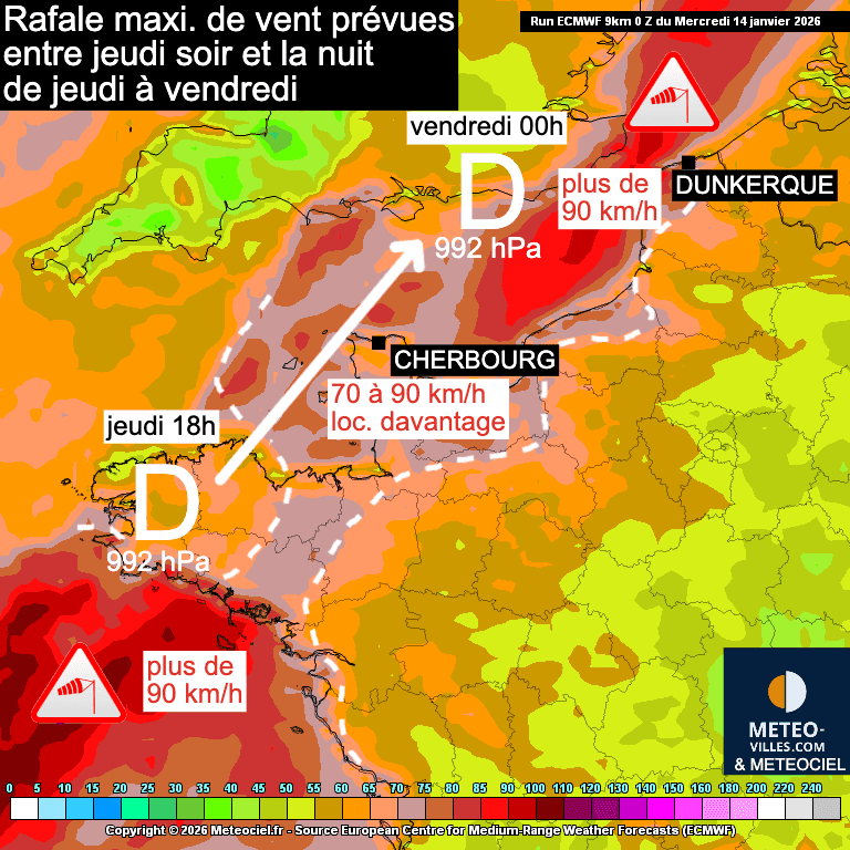 Selon le modèle météo européen (CEP) de mardi 00h, Jeudi, une dépression devait rapidement se former au large de la Cornouailles, atteignant 983 hPa à 18h sur la pointe sud-ouest de l’Angleterre. Dans cette configuration, les vents auraient pu largement dépasser les 100 km/h sur une grande partie de la Manche. À minuit, la dépression se serait encore un peu creuser à la hauteur du Cotentin avec des rafales pouvant atteindre ou dépasser 150 km/h entre les îles Anglo-Normandes et l’extrême nord du Cotentin.
