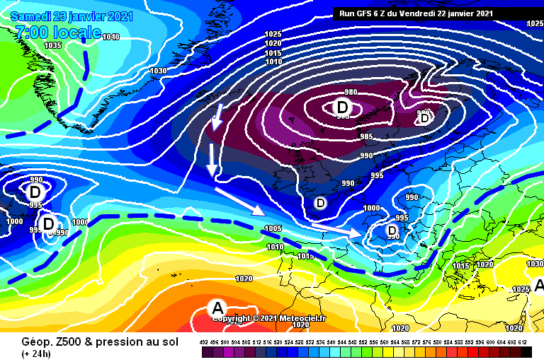 Schéma de la situation atmosphérique sur l’Ouest de l’Europe ce samedi 23 janvier 2021 – Modèle GFS via météociel.fr