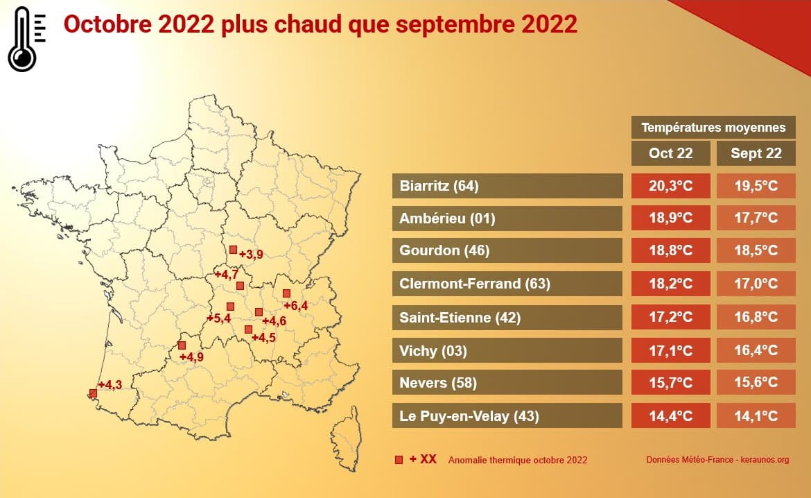 L'anomalie thermique d'octobre 2022 fut si spectaculaire que ce mois fut plus chaud que septembre 2022 dans certaines villes ! C'est le cas de Clermont-Ferrand où la température moyenne en octobre 2022 fut de 18,2°C contre 17,0°C en septembre 2022 ! C'est aussi le cas à Biarritz, Ambérieu, Gourdon, Saint-Étienne, Vichy, Nevers ou encore au Puy-en-Velay. Il est rarissime d'observer un mois d'octobre plus chaud que septembre, considérant que la baisse des températures est censée s'accélérer à cette époque de l'année. De plus, septembre 2022 avait terminé au-dessus des normales (+0,7°C).
