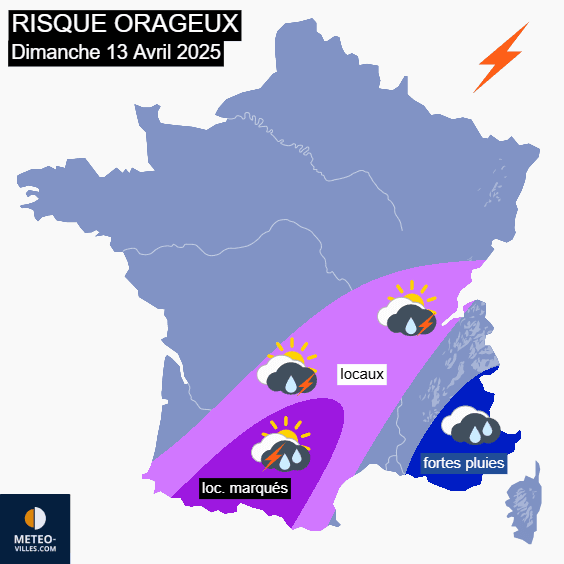 Carte du risque orageux pour le dimanche 13 avril 2025 - Météo Villes