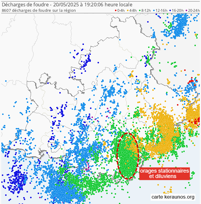 Carte des éclairs sur la région PACA ce mardi 20 mai 2025 - via keraunos.org