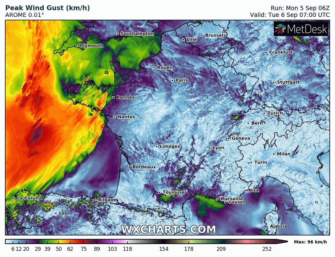 Animation des rafales de vent au passage des orages en journée du mardi 6 septembre 2022 – Modèle arome via WX CHARTS