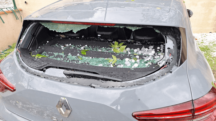 Voiture endommagée par la grêle à Puylaurens (81) ce lundi 19 mai 2025 - photo Marie-Sophie Héraud