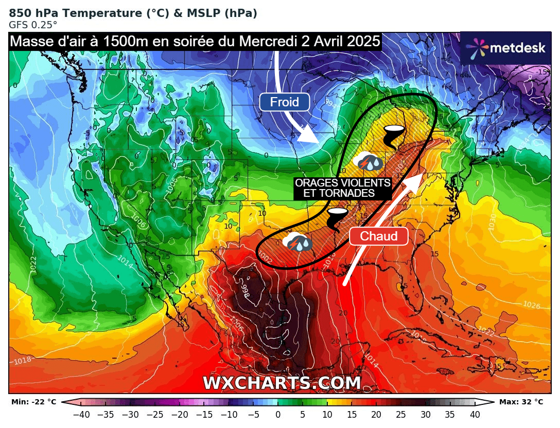 Un conflit de masses d'air majeur s'est produit ces dernières heures dans la partie est des États-Unis. Une coulée d'air froid est arrivée par le Canada, soulevant une langue d'air chaud du golfe du Mexique jusqu'aux États du nord-est. Ce mercredi 2 avril 2025, la rencontre entre ces deux masses d'air radicalement différentes a créé un contexte très favorable aux orages violents et organisés sur un axe reliant le Texas à l'Ohio.