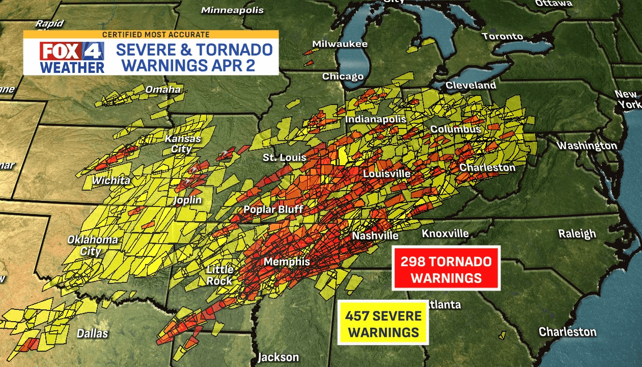 L'épisode orageux a tenu toutes ses promesses et a touché les zones géographiques ciblées par les services météo américains. Sur le pied de guerre, ces derniers ont émis des centaines d'avertissements d'orages violents (au nombre de 457) du nord du Texas jusqu'à l'Ohio. Plus impressionnant, 298 avertissements de risque imminent de tornades ont été émis ! Un chiffre considérable qui montre le grand nombre de secteurs qui ont été exposés de près à ce risque ce 2 avril.
