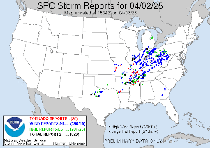Plus concrètement, la NOAA a répertorié au moins 29 reports de tornades aux États-Unis sur la journée du mercredi 2 avril 2025 et la nuit suivante ! Missouri, Arkansas, sud-Illinois, ouest-Tennessee et ouest-Kentucky ont été les plus frappés. Parmi ces tornades, certaines ont été de forte intensité et causé d'importants dégâts. Notons que des dizaines de phénomènes venteux non-tornadiques (comme des microrafales) ont été observés entre Illinois, Indiana, Kentucky, Ohio et Virginie-Occidentale, causant aussi des dommages.