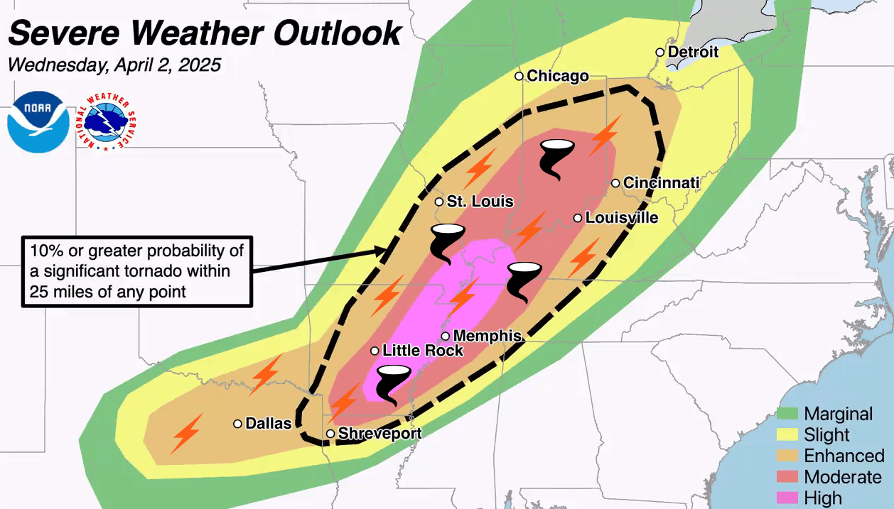 Risque orageux maximal dans la Dixie Alley pour le mercredi 2 avril 2025 - NOAA