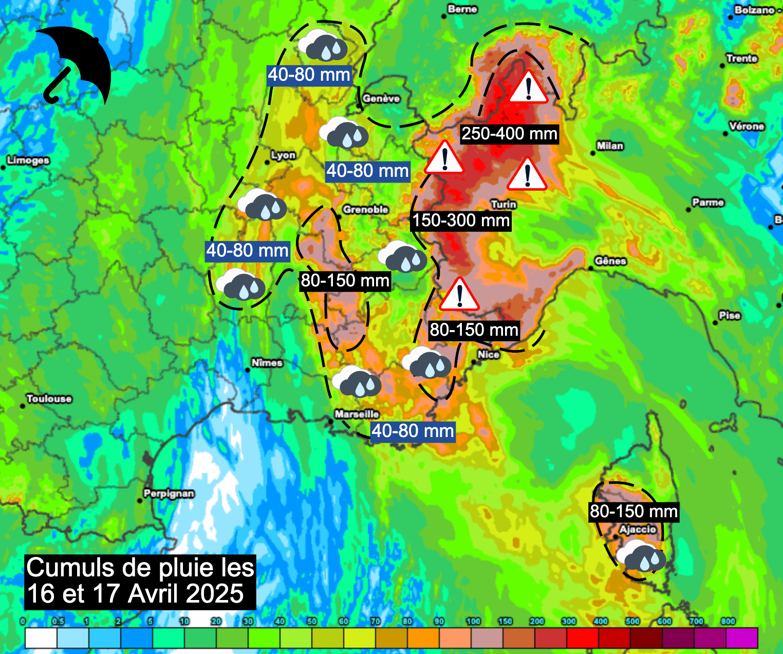 Les cumuls sur 48 heures promettent d'être importants dans le sud-est de la France et notamment de la côte d'Azur à l'Ardèche et au Jura où ils atteindront souvent 40 à 80 mm. Toutefois, ils pourront atteindre ponctuellement 100 à 150 mm sur les massifs pré-alpins ainsi que sur les Alpes frontalières. Sur les versants frontaliers exposés à l'est, on pourra même dépasser les 150 mm avec jusqu'à 250 à 400 mm côté italien !
