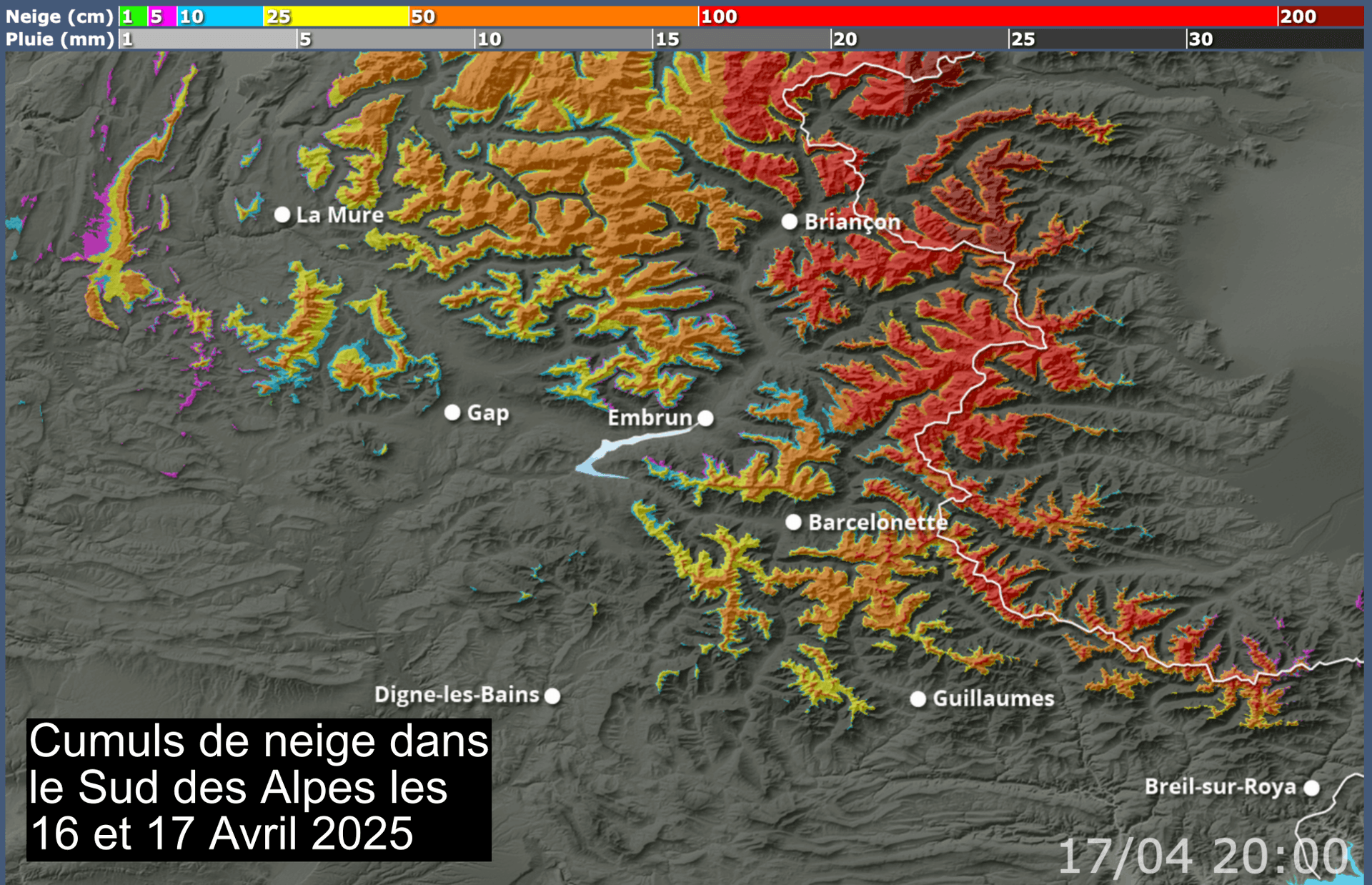 Cumuls de neige dans les massifs du sud des Alpes les mercredi 16 et jeudi 17 avril 2025 - skipass.com