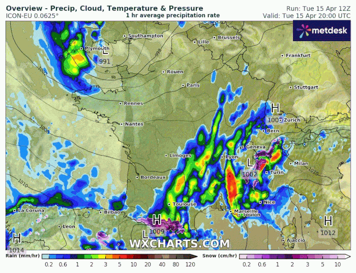Des orages ont éclaté au sud-est ce mardi. L'instabilité va perdurer puisqu'un minimum dépressionnaire se creusera dans le golfe de Gênes ces mercredi 16 et jeudi 17 avril 2025. Il va causer l'ondulation d'un front pluvieux durant ces deux jours sur l'est de la France et la Suisse, couplé à un retour d'est sur les Alpes frontalières où les cumuls seront très importants.