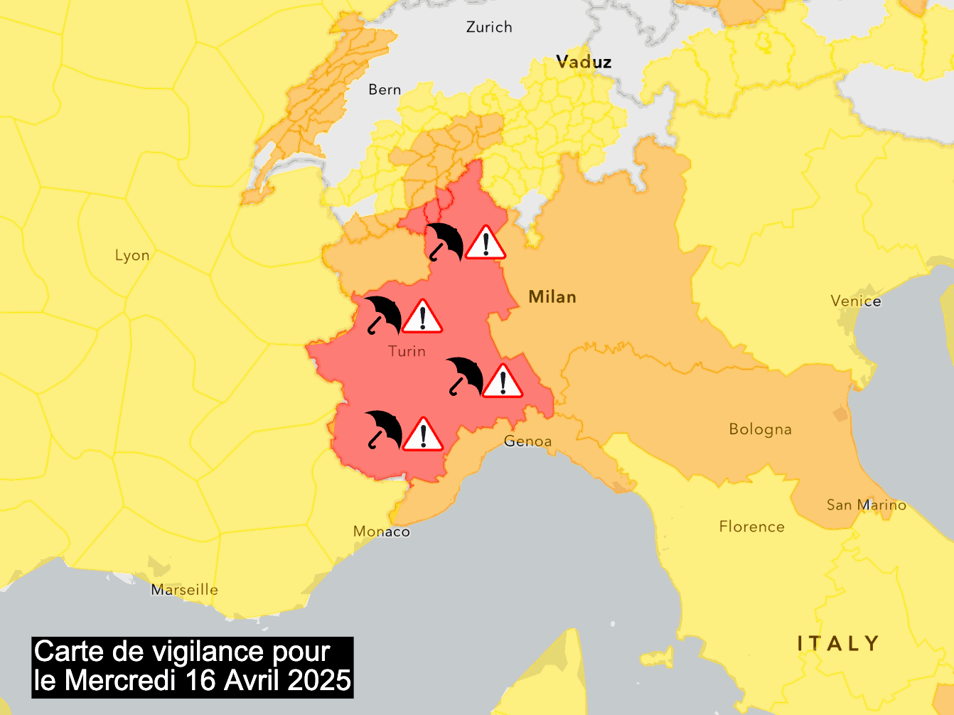Alerte rouge aux pluies et aux inondations entre Italie du Nord et Suisse ce mercredi 16 avril 2025 - Meteoalarm