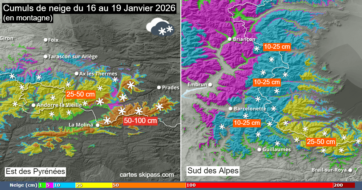 Cumuls de neige prévus du vendredi 16 au lundi 19 janvier 2026 - skipass.com