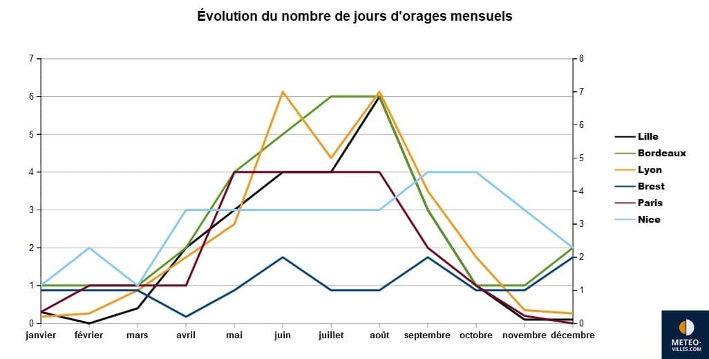 Si les orages deviennent plus réguliers entre la fin de l'hiver et le début du printemps, c'est notamment à partir du mois de mai que ceux-ci se font les plus récurrents à travers le pays. Par exemple, Entre février et mai, le nombre de jours d'orages passe de 0 à 3 à Lille ou encore de 1 à 4 à Bordeaux et Paris.