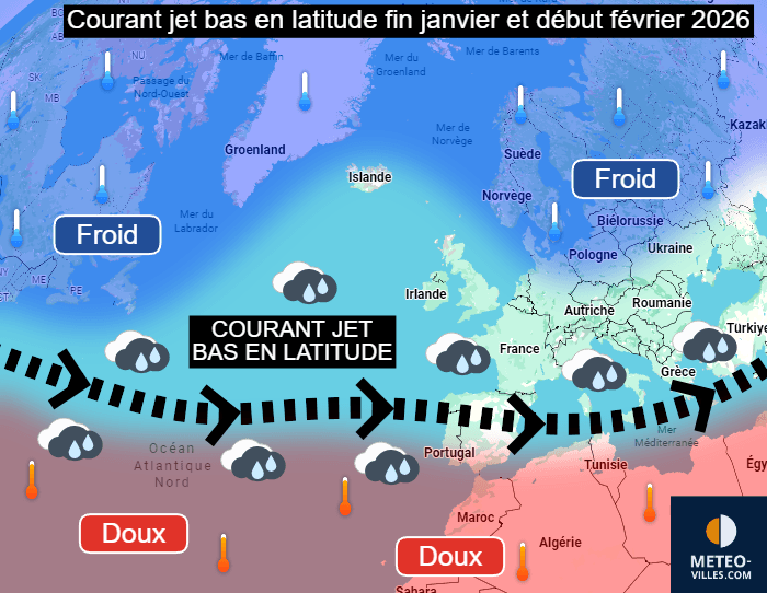 Schéma montrant la circulation basse en latitude du courant jet fin janvier et début février 2026 - Météo Villes