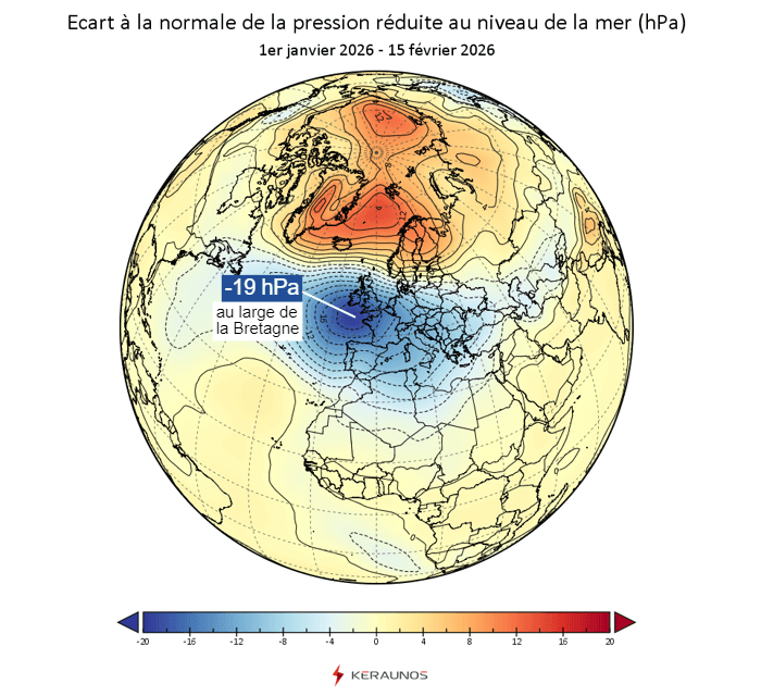 Ainsi, cela fait maintenant plusieurs semaines que l'activité dépressionnaire est particulièrement marquée sur notre pays et globalement sur tout l'ouest de l'Europe. Sur la période du 1er janvier au 15 février 2026, l'anomalie de pression atteint -19 hPa par rapport à la normale au large de la Bretagne ! Un tel déficit sur une période de 45 jours est spectaculaire et témoigne de l'activité dépressionnaire hors norme qu'a subi la France. Si vous consultez régulièrement votre baromètre, vous avez surement remarqué que la pression est souvent très basse depuis le début de l'année 2026.