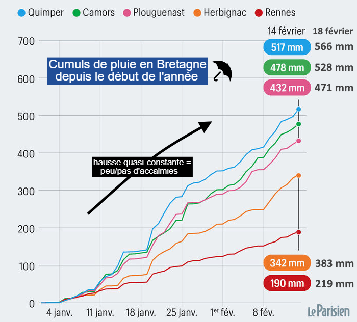 Sur les 45 premiers jours de l'année, 39 ont enregistré au moins 1 mm de pluie en moyenne nationale ! Cela signifie que 87% des jours ont été pluvieux en France depuis le début 2026, un chiffre remarquable ! Non seulement la pluie a été anormalement fréquente mais elle est aussi anormalement abondante. La Bretagne symbolise cet excès de pluie avec des cumuls tout bonnement remarquables. Au 18 février, il est déjà tombé 566 mm de pluie à Quimper depuis le début de l'année ! Cela représente 260% du cumul normal, c'est à dire qu'il est tombé 2,6 fois plus de pluie que lors d'un début d'année moyen ! Jamais de telles pluies n'avaient été observées depuis le début des mesures. Sur le graphique ci-dessous, on note l'absence d'accalmie avec des courbes qui croissent presque continuellement.