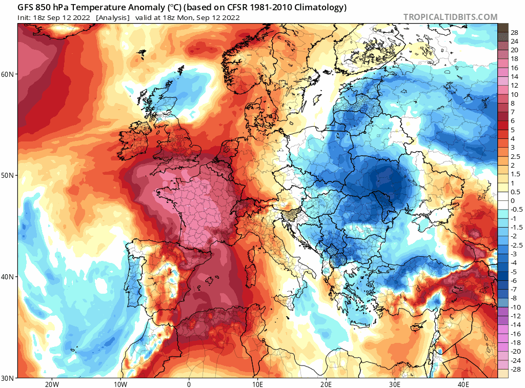 En ce début de semaine, une goutte froide est positionnée au nord-ouest de la péninsule ibérique. Elle pilote un flux de secteur sud à sud-est qui a fait remonter un air anormalement chaud sur la France, en provenance directe d'Afrique. Ainsi, de nombreux records mensuels de chaleur ont été battus dans l'ouest du pays en après-midi du lundi 12 septembre 2022, suivis de records de douceur nocturne la nuit suivante.
