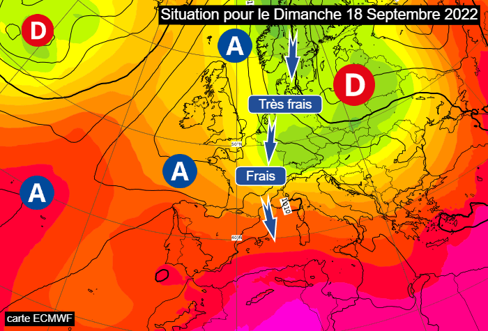 La journée du mercredi 14 septembre 2022 sera encore dominée par une chaleur modérée et lourde avec des déclenchements orageux. L'instabilité reculera jeudi 15 avec l'infiltration de l'air frais sur toutes les régions du nord mais ce n'est véritablement qu'à partir du vendredi 16 que le thermomètre s'effondrera sous les normales de saison. Il confirmera sa baisse samedi 17. Il ne fera plus que 15 à 17°C dans le nord-est, 18 à 20°C au nord-ouest et 22 à 25°C de l'Aquitaine à la Méditerranée.