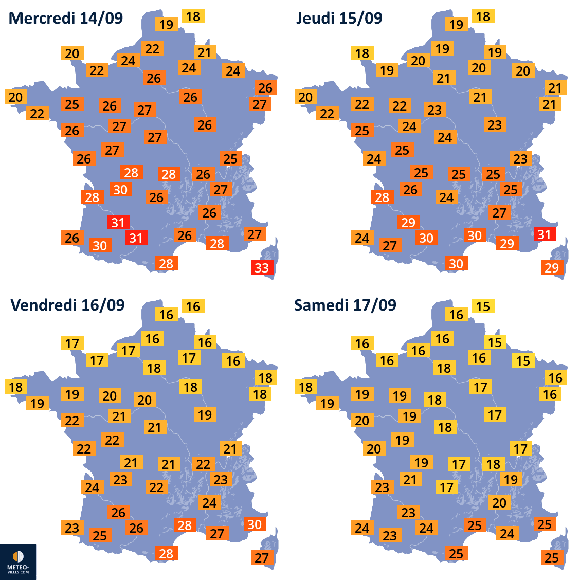 Prévisions des températures maximales du mercredi 14 au samedi 17 septembre 2022 - Météo Villes