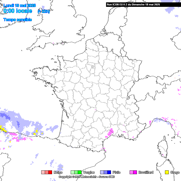 Prévision de la pluie (en violet) et des orages (en jaune) entre lundi 19 mai à 00h et mercredi 21 mai à 11h - modèle météo Icône (Météo allemande)