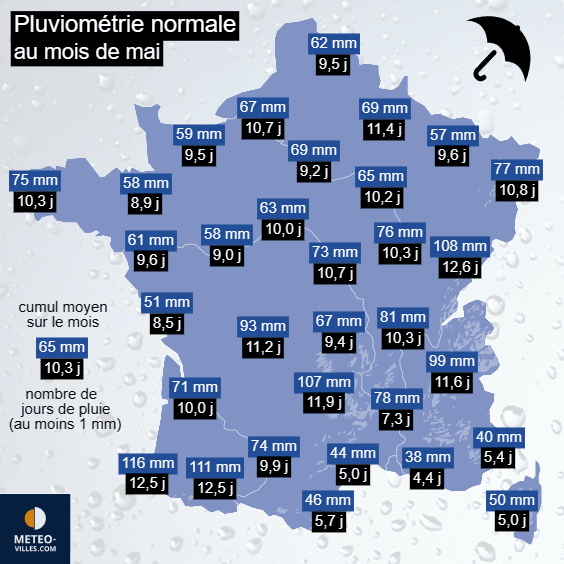 Avec l'augmentation des températures, l'instabilité tend également à croître au cours du mois de mai qui est traditionnellement celui qui démarre la saison orageuse. Par conséquent, les cumuls moyens de pluie en mai sont relativement élevés. La normale est de 62 mm à Lille, 69 mm à Paris, 71 mm à Bordeaux, 77 mm à Strasbourg ou 81 mm à Lyon. Elle atteint les 116 mm à Biarritz mais ne dépasse pas 38 mm à Marseille et 40 mm à Nice. On note en moyenne 9 à 12 jours de pluie (au moins 1 mm) en mai, sauf en Méditerranée où les chiffres sont de 4 à 6 jours. Notons que dans certains secteurs du pays, le mois de mai le plus arrosé de l'année. C'est notamment le cas à Paris, Toulouse ou Strasbourg.