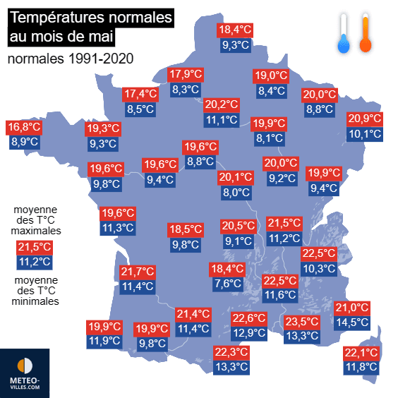 Normales des températures minimales et maximales au mois de mai - Météo Villes
