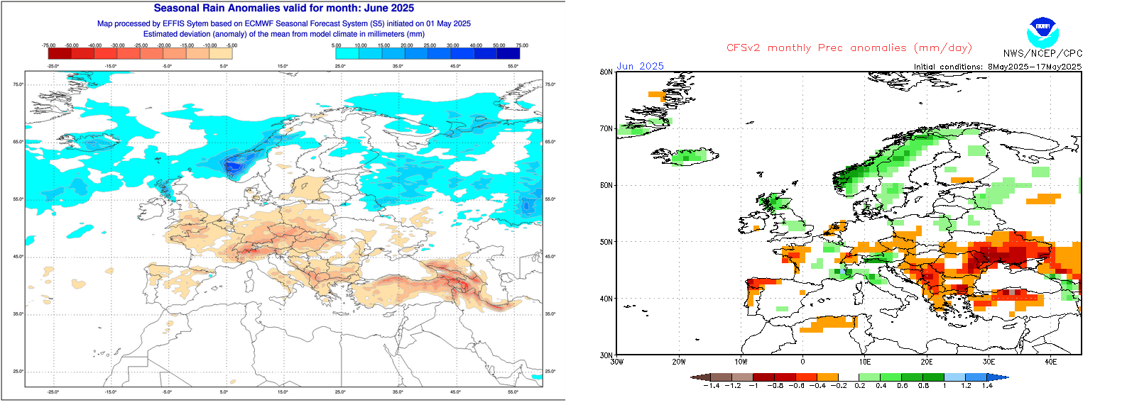 Anomalies de précipitations sur l'Europe pour le mois de juin 2025 – ECMWF et CFS