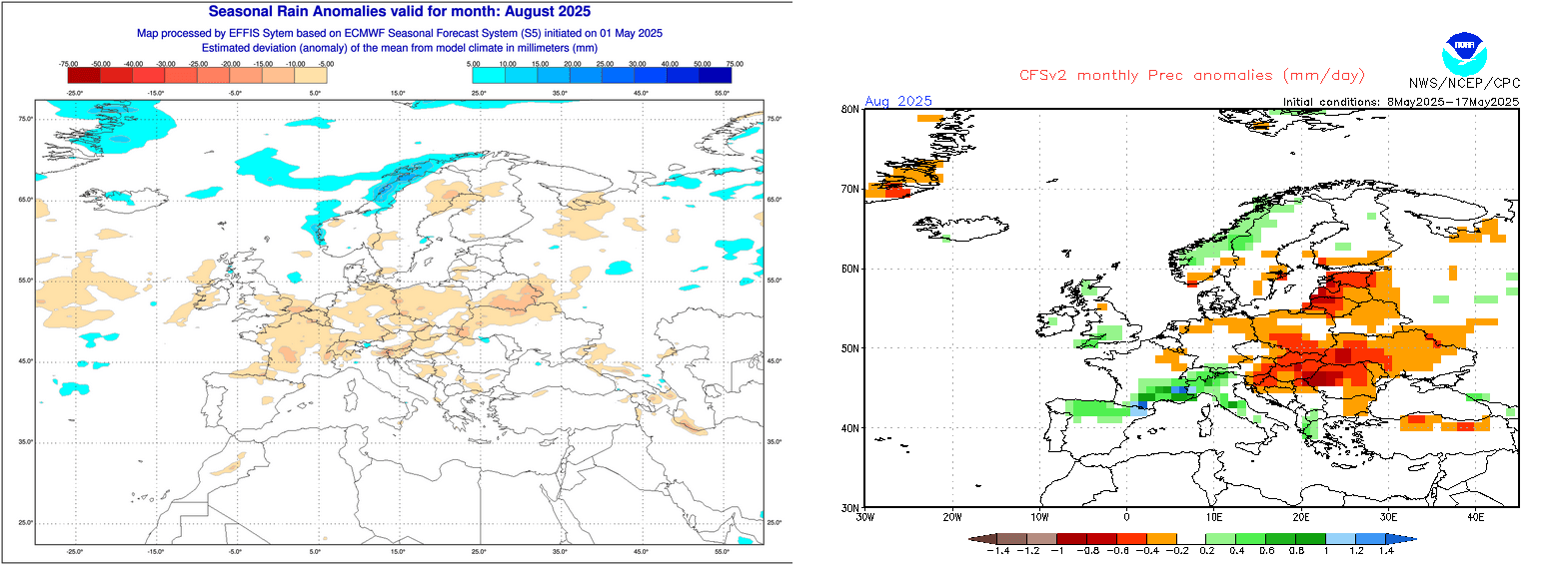 Anomalies de précipitations sur l'Europe pour le mois d'août 2025 – ECMWF et CFS