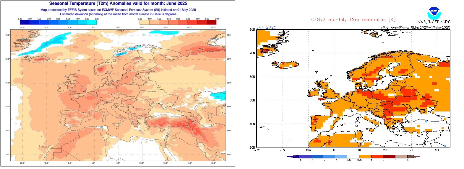 Anomalies de températures sur l'Europe pour le mois de juin 2025 – ECMWF et CFS