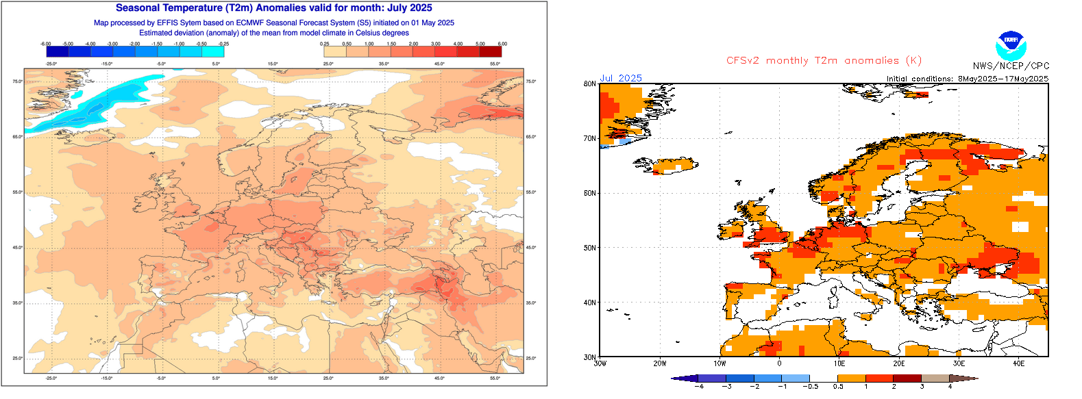 Anomalies de températures sur l'Europe pour le mois de juillet 2025 – ECMWF et CFS